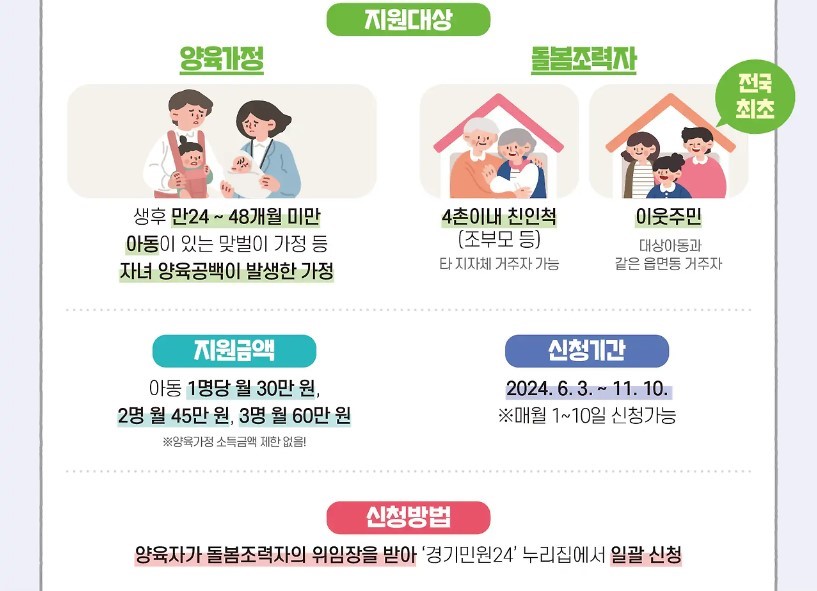 | 지원 금액 | ◼아동 1명 월 30만 원 / 2명 월 45만 원 / 3명 월 60만 원 ※ 4명 이상일 경우, 돌봄 조력자가 2명 이상이어야 함 ※ 양육가정 소득금액 제한 없음 |
