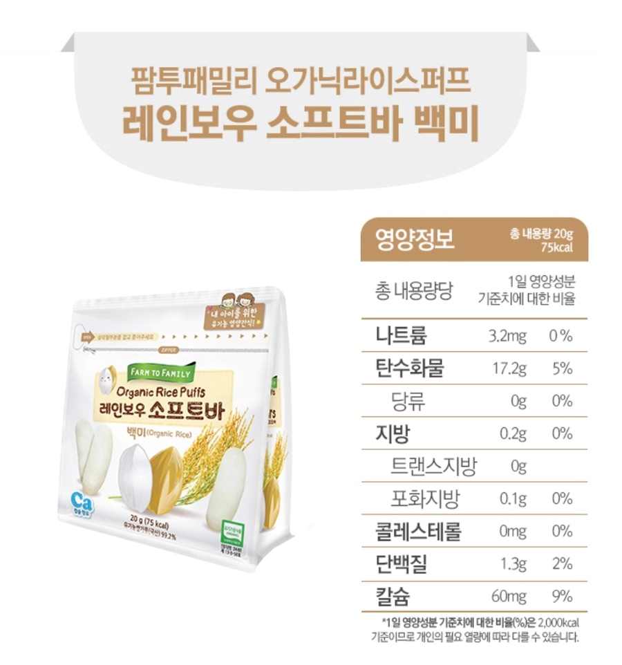 떡뻥도 브랜드가 참 많습니다. 저희 아이는 팜투베이비에서 판매하는 간식박스로 떡뻥을 시작했어요. 맛이 가장 순하고 가미가 거의 되지 않은 레인보우 소프트바 백미 떡뻥을 첫 떡뻥으로 정했었습니다.