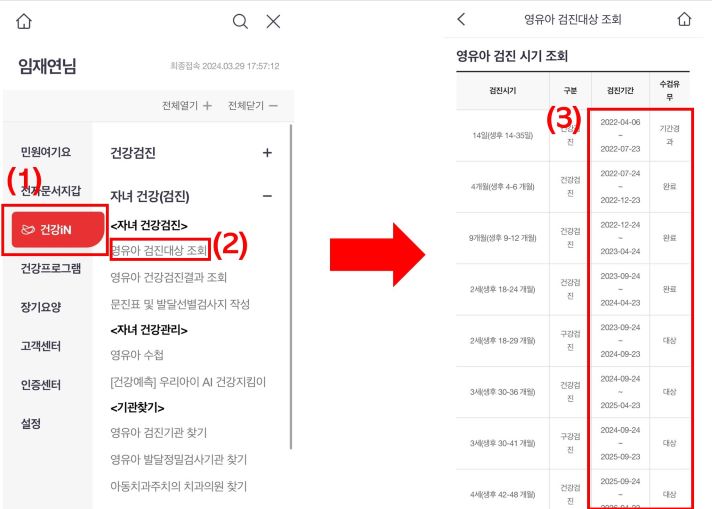 ▪️건강iN(1) 클릭 > 영유아 검진대상 조회(2) 클릭하면 영유아 검진 시기(3) 조회 가능