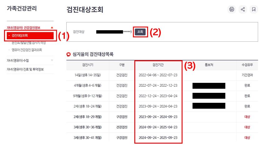 2) 검진대상조회(1) > 조회(2) 클릭 > 검진기간(3) 확인 가능