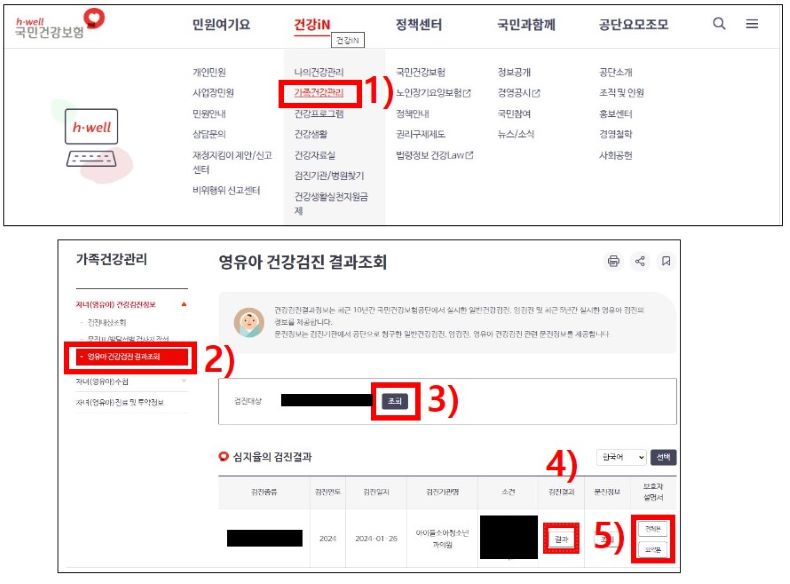 국민건강보험 홈페이지 건강iN > 1)가족건강관리 > 2) 영유아 건강검진 결과조회 > 3) 조회 > 4) '결과' 클릭시 병원에서 받았던 것과 동일한 결과표를 출력할 수 있습니다.